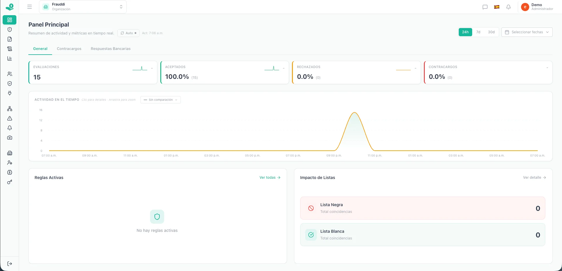 Evaluaciones, aceptaciones, rechazos y contracargos. Actividad temporal, reglas activas e impacto de listas — todo en un dashboard.